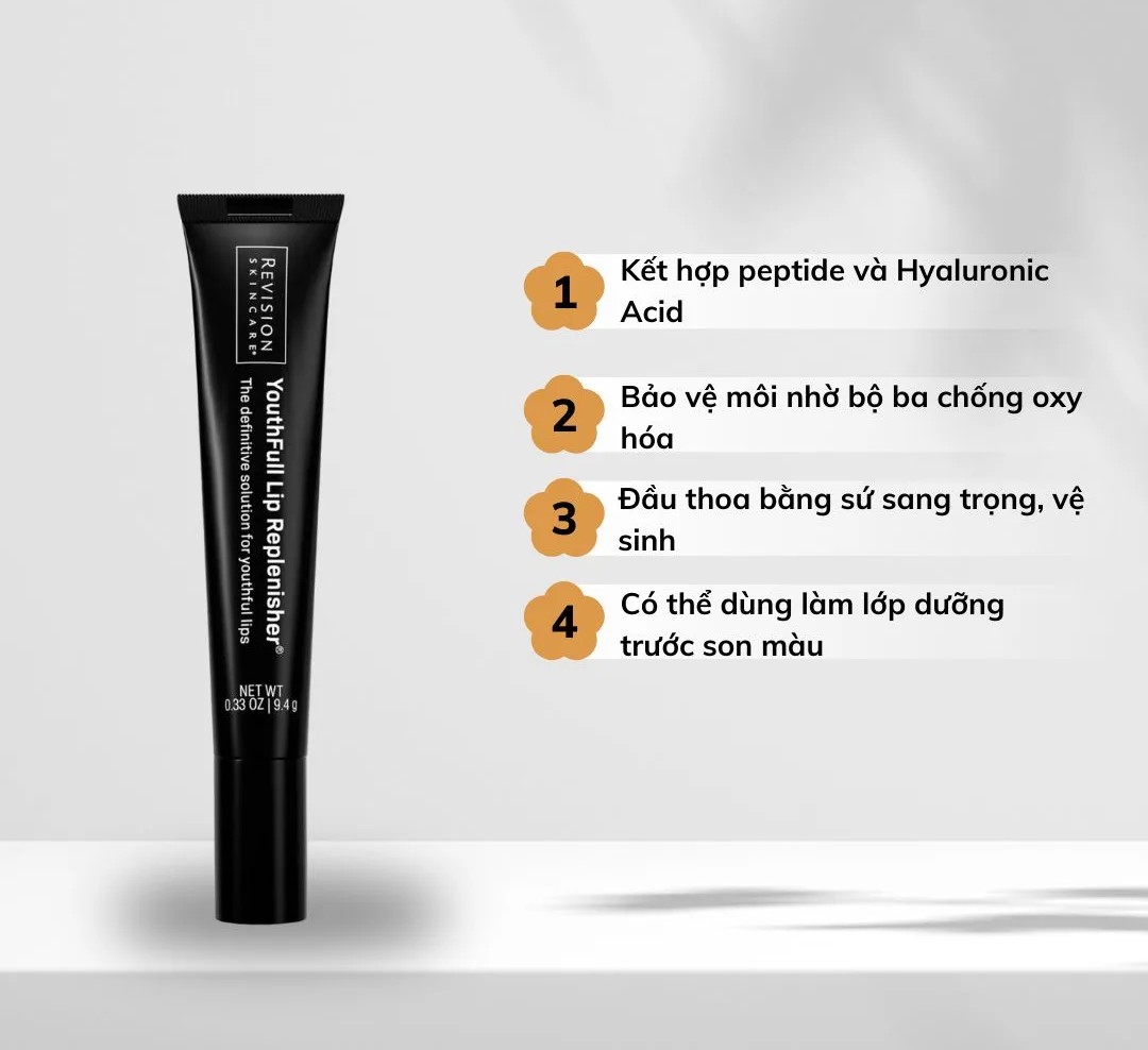 Revision Skincare YouthFull Lip Replenisherdưỡng môi cao cấp giúp phục hồi, làm đầy và dưỡng ẩm sâu cho đôi môi nhờ công nghệ peptide tiên tiến và Hyaluronic Acid. Cho đôi môi căng mọng, mịn màng và rạng rỡ tự nhiên chỉ sau vài lần sử dụng.