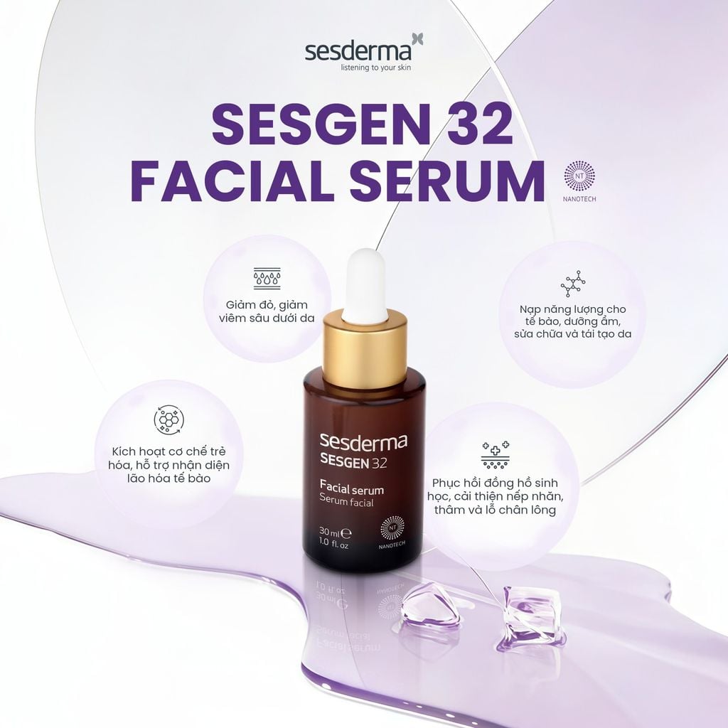 Khác với các sản phẩm chỉ hoạt động trên bề mặt, Sesgen 32 ứng dụng công nghệ Nanotech Liposome kết hợp các hoạt chất kích hoạt gen, giúp vận chuyển dưỡng chất xuống sâu trong da. Nhờ đó, sản phẩm hỗ trợ kéo dài tuổi thọ tế bào, phục hồi tổn thương và cân bằng nhịp sinh học tự nhiên của làn da.